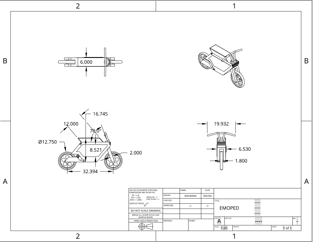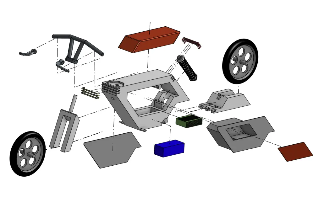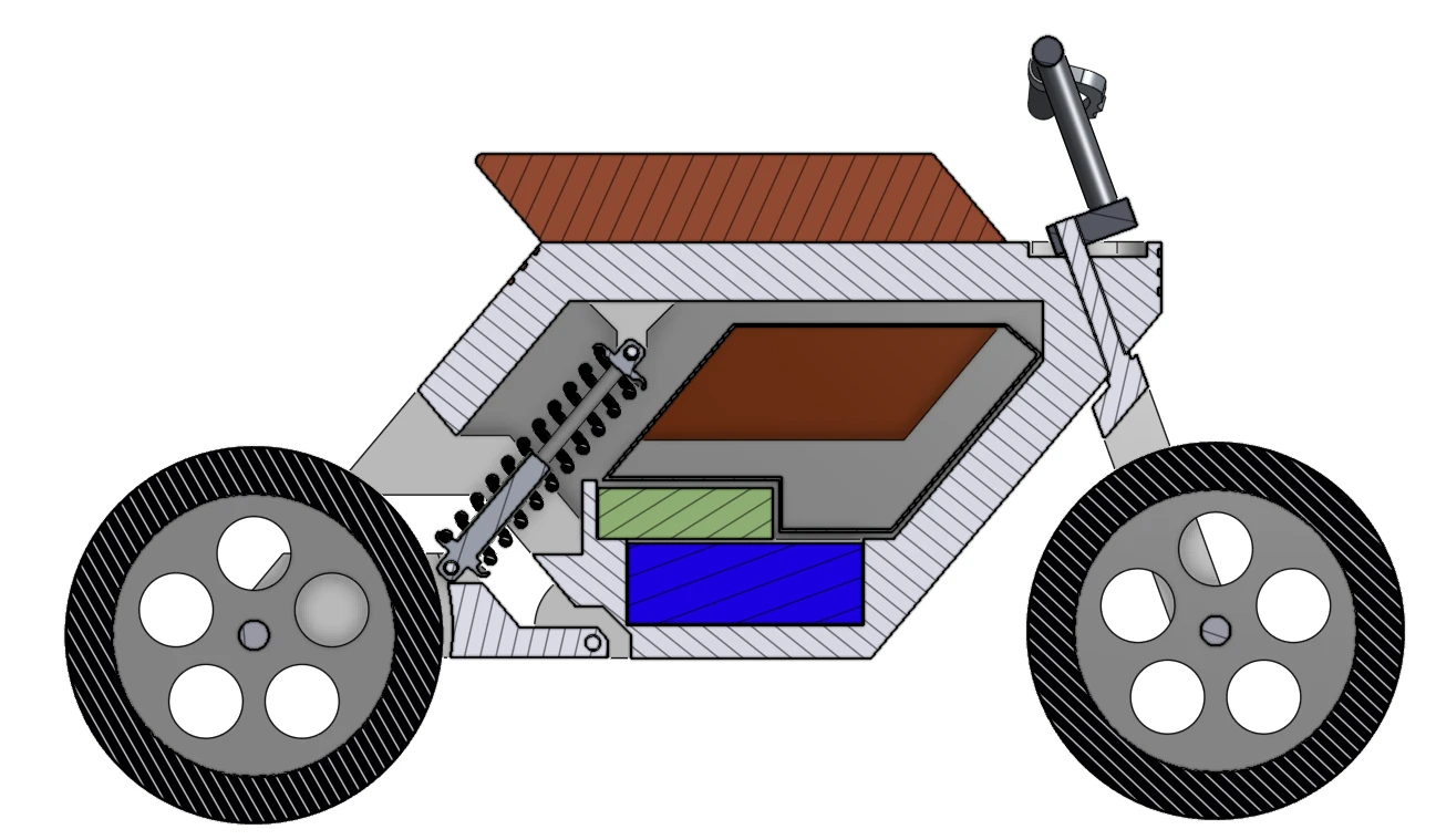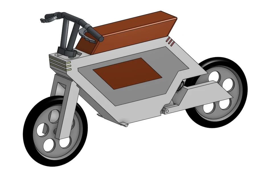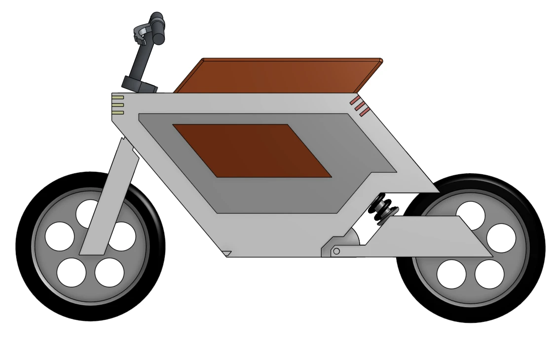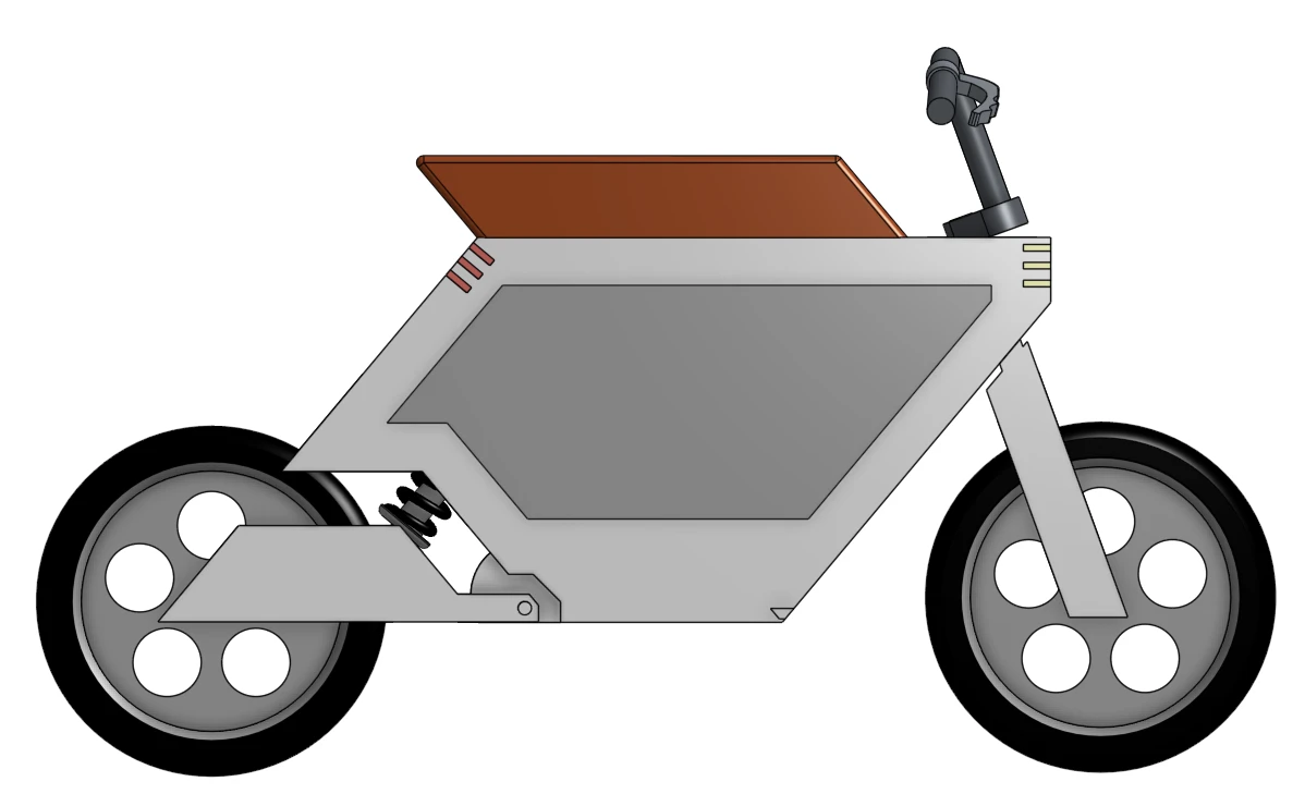 This is eMOPED v.1: a compact electric bike. The bike features rear suspension, integrated headlight and taillight, and easily serviceable infrastructure for a 48V 1000W power output. Removal of the right side panel gives the user access to the shock, controller, and low mounted battery for increased stability. Removal of the smaller colored panel on the left side gives the user access to the 3 cubic foot storage cell.