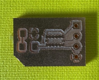 Here is the result of the milling process. In the PCB design, I didn't notice this at first (mainly because I wasn't aware), but the ADXL343 pads are interesecting by the really thin red line. This would have risen the alarm bells only if I used the [rules checker] function in KiCad.
