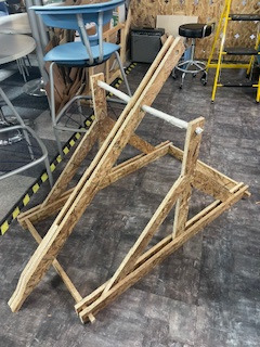 The first design is based around hanging weights with holes for poles to hang on. Hanging the weight decreases the rotational moment of inertia, allowing the arm to spin much faster and therefore launch the projectile further.