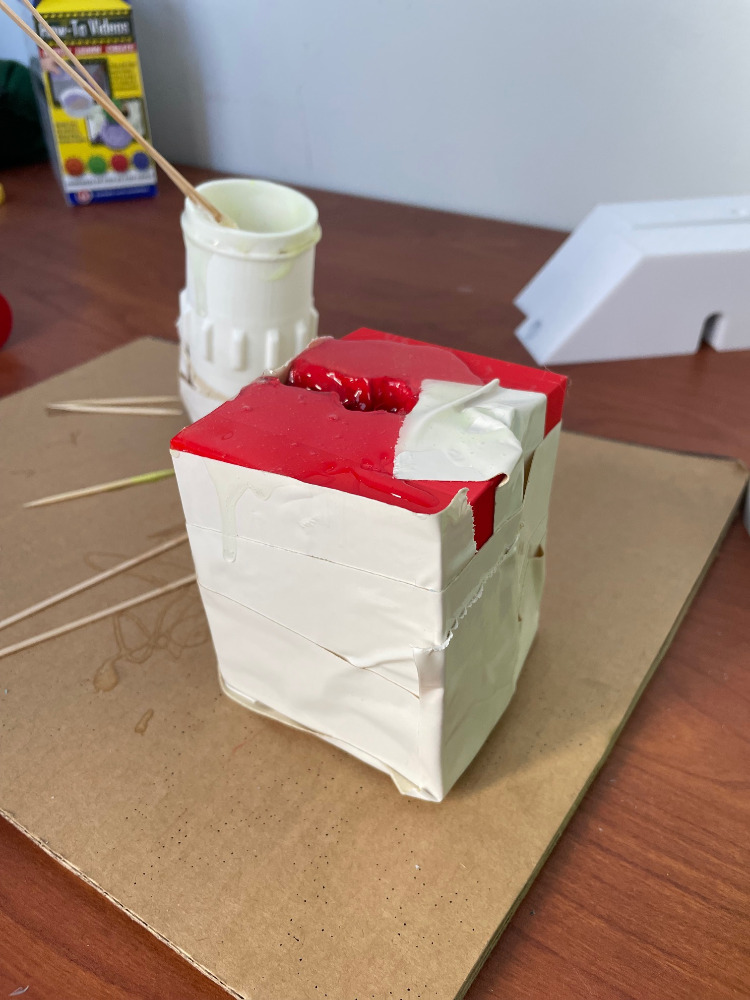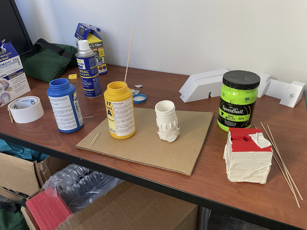 We ran out of cups, and I couldn't find the pigments, and I couldn't find popsicle sticks. Abusing PVC and duct tape saves me again.