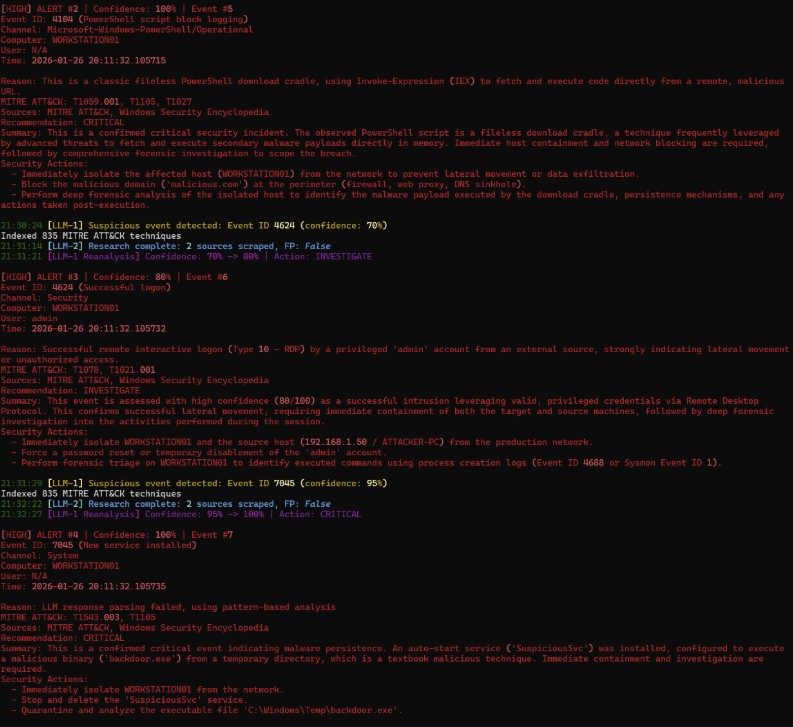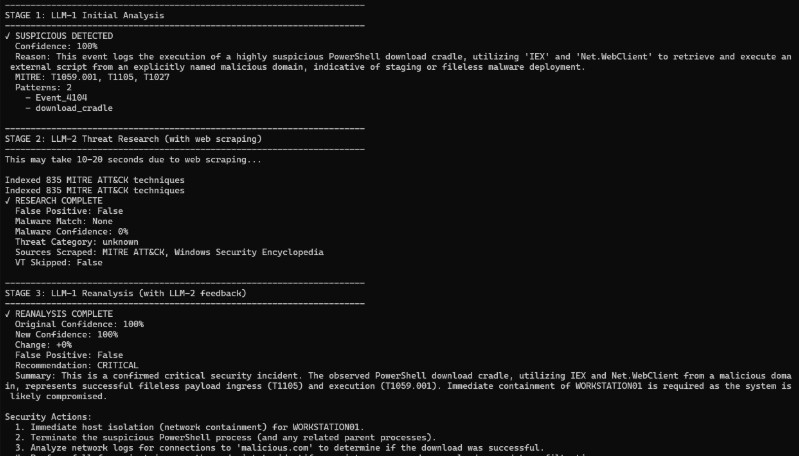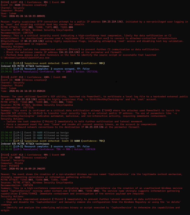 EVTX parsed into json, sent to LLM, sent to LLM2 for review with datascraping to cross-reference confidence, sent back to LLM1 with feedback after scraping data, LLM1 makes final decision based on new information and displays security recommendations for remediation / investigation.