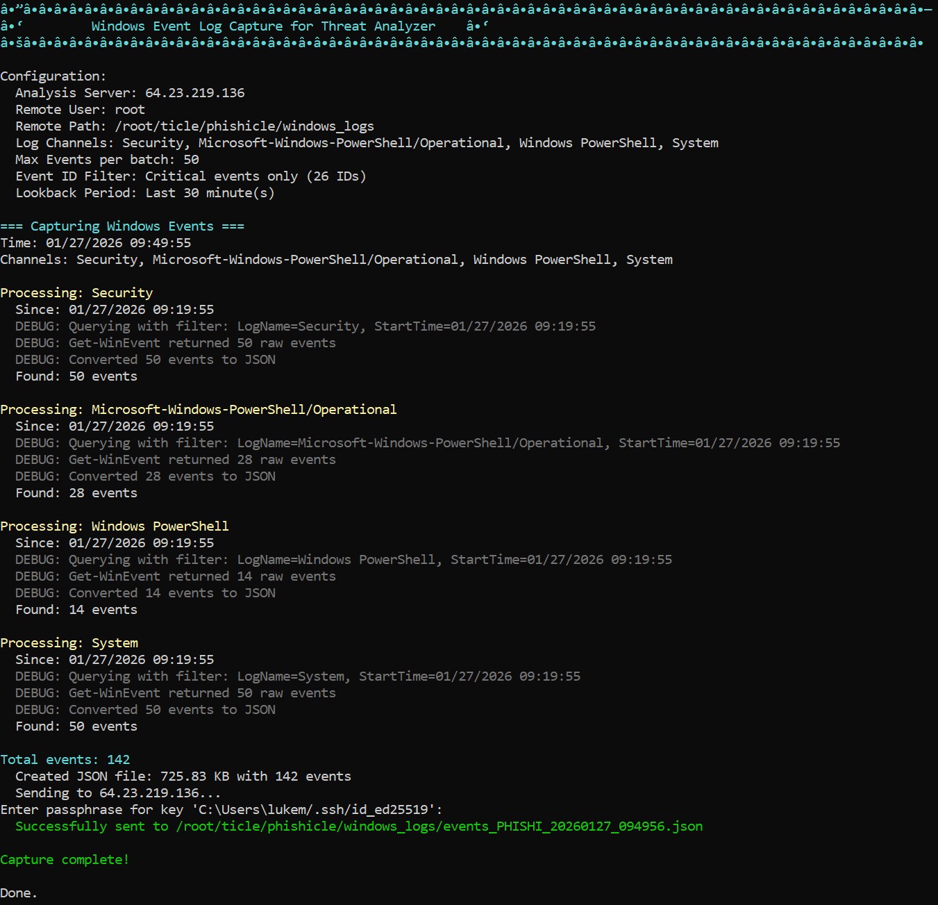 A powershell script is run on the Windows VM to forward the data to the remote server where the main project is running. The file is sent over ssh and is stored in the windows_logs directory. Event log size is determined by -Maxevents and -LookBackMinutes parameters.